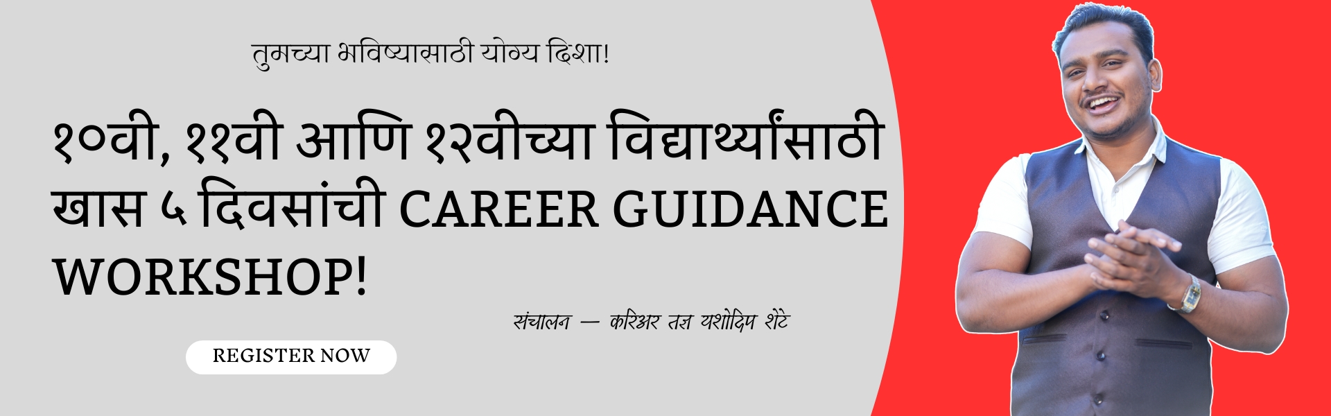 १०वी, ११वी आणि १२वीच्या विद्यार्थ्यांसाठी खास ५ दिवसांची ऑनलाइन वर्कशॉप! — वैयक्तिक मार्गदर्शन आणि अनुभवी तज्ज्ञांच्या सहाय्याने तुमच्या भविष्यासाठी योग्य करिअर निवडण्याचा आत्मविश्वास मिळवा.